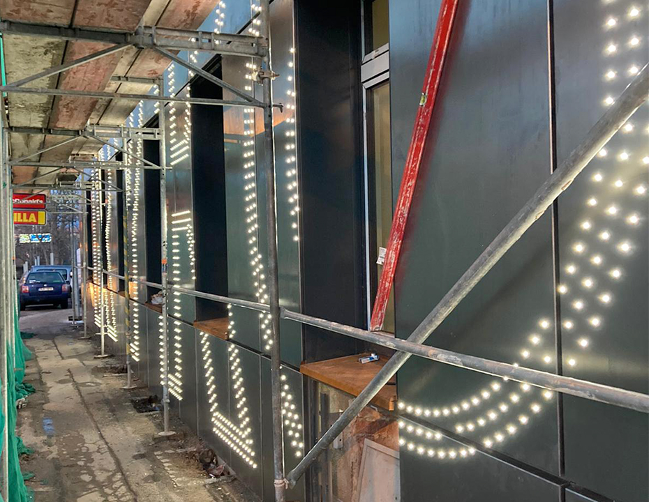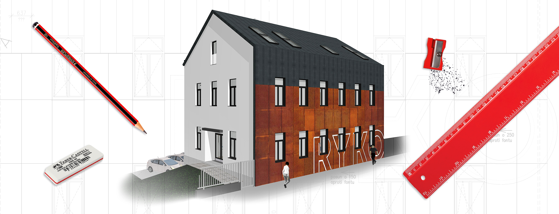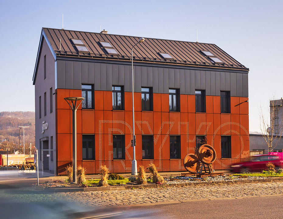Architektonický návrh rekonstrukce administrativní budovy, včetně grafického návrhu a uměleckého zpracování sousoší na kruhovém objezdu před objektem.